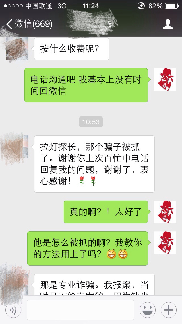 助人乃快乐之本,拉灯探长得知情况后对于粟女士的遭遇非常同情,同时对于骗子也是恨之入骨,所以决定对于粟女士不收取任何的费用,全部免费提供帮助,最终就在今日上午,喜讯传来,骗子被捕了!